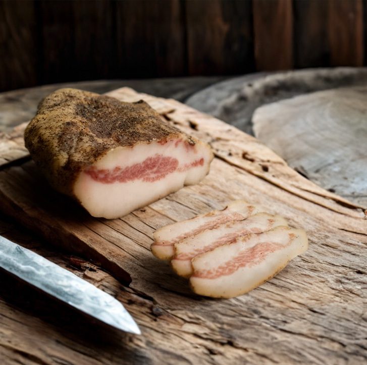 Onze guanciale wordt in eigen worstmakerij gemaakt van varkenswang, gekruid en langzaam gedroogd. Onmisbaar voor klassieke Italiaanse gerechten zoals pasta carbonara of amatriciana.